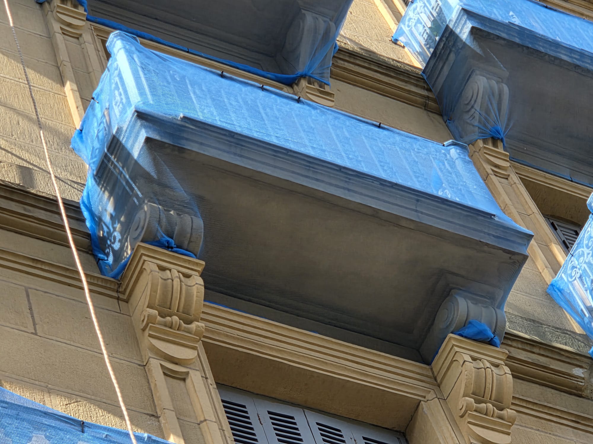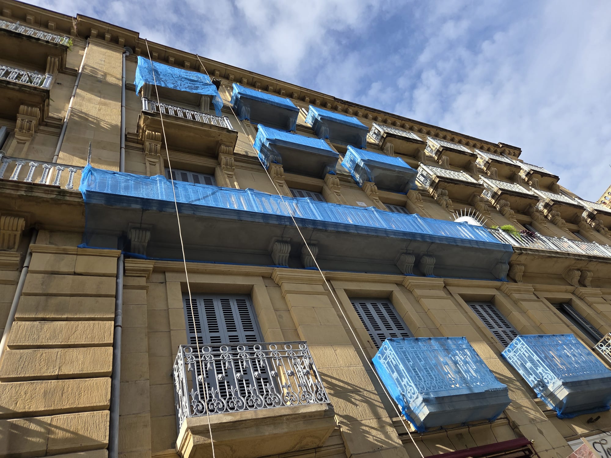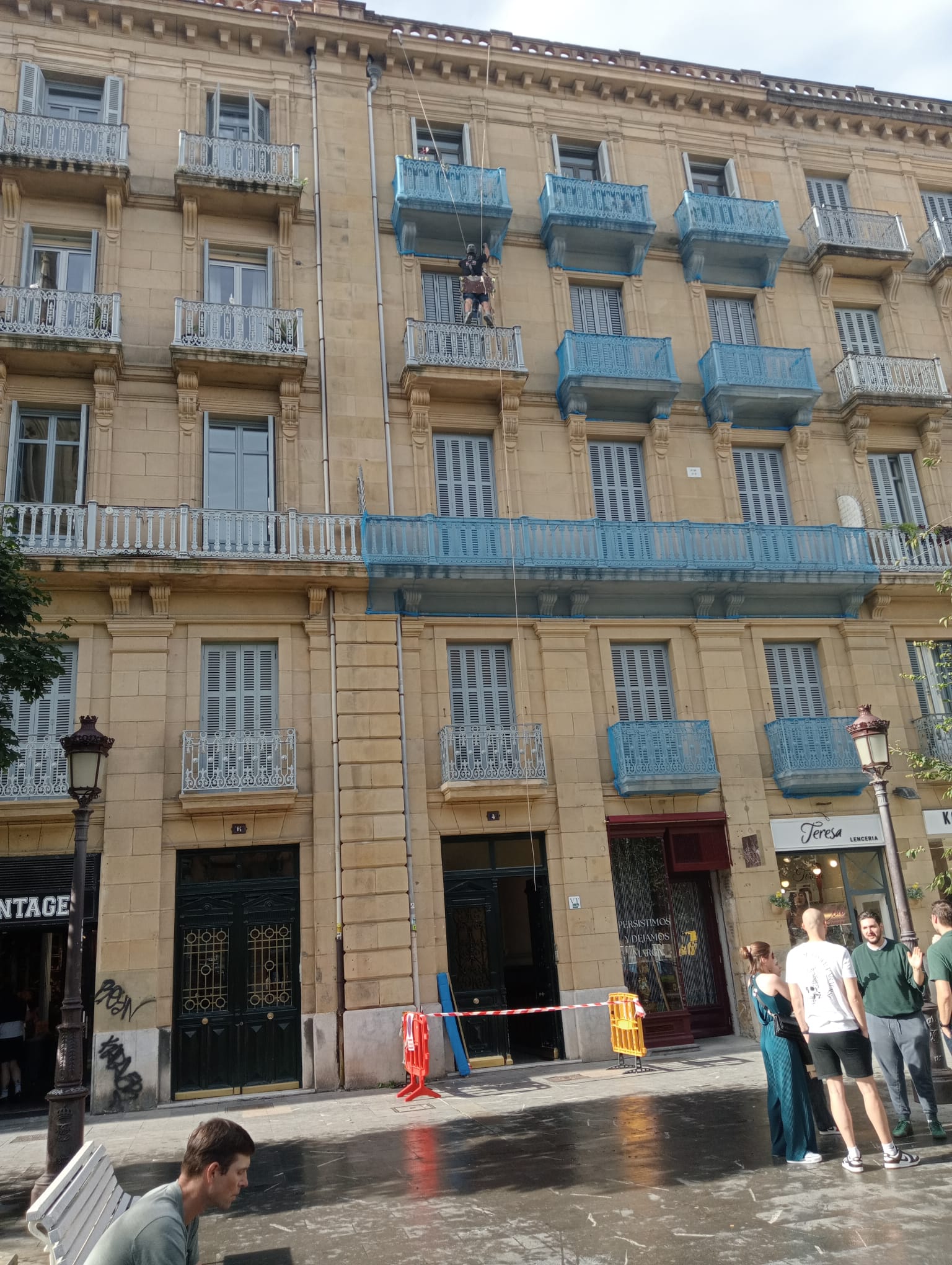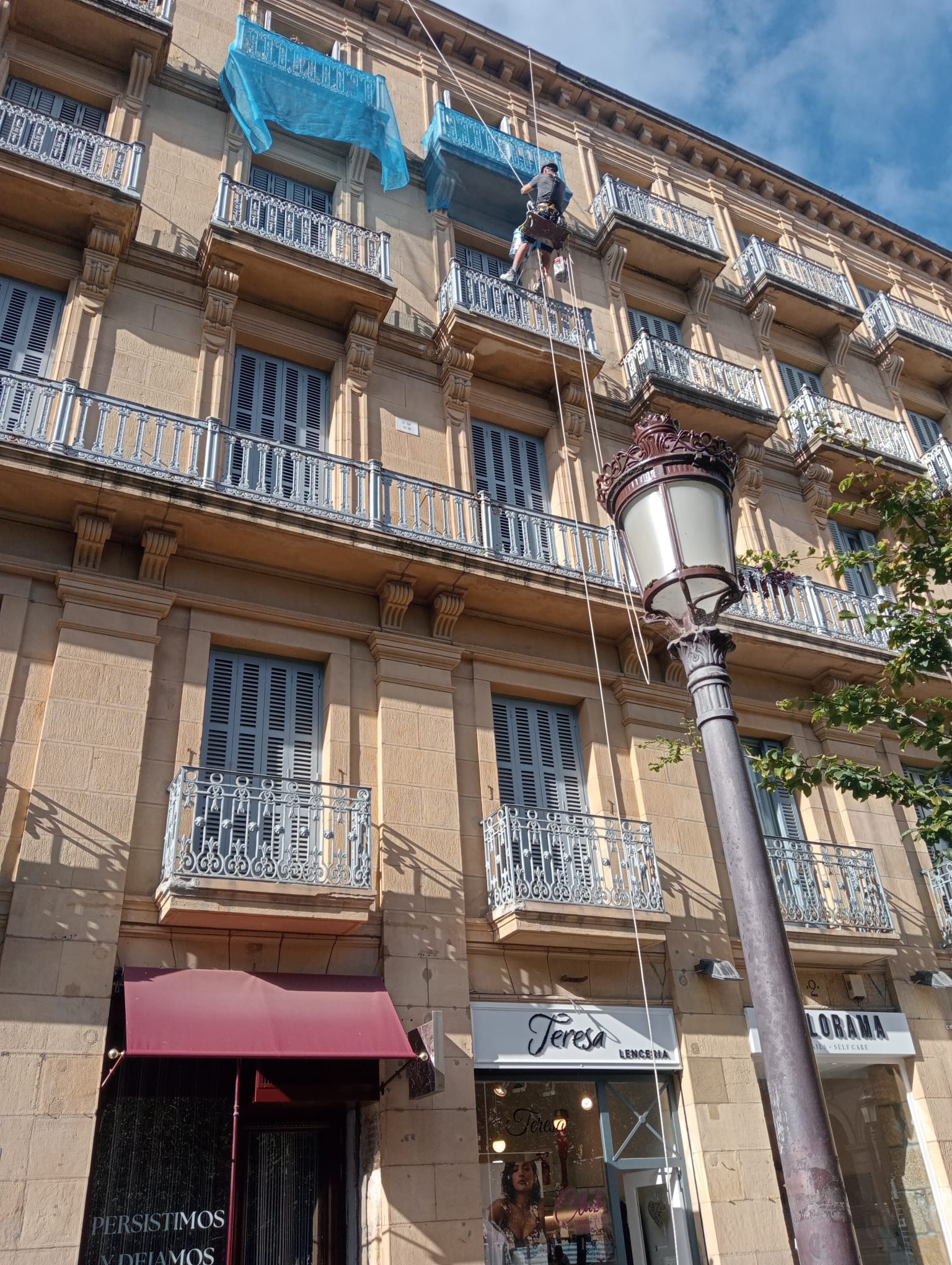 Colocación de redes de protección en balcones mediante trabajos verticales.